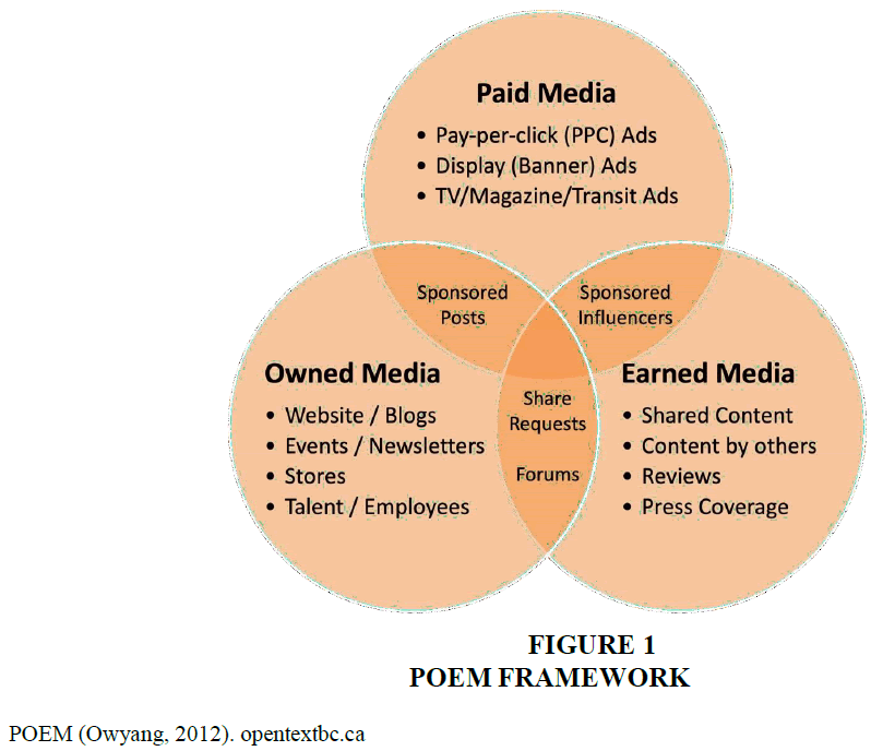 The POEM framework is widely recognized as an effective tool for understanding the interconnectedness of various marketing activities and visually demonstrating these relationships. Green (2011) emphasizes the importance of integrating the POEM framework, noting that the primary focus of paid media is to lead customers toward the earned and owned media, with effective integration being crucial for achieving this transition. This idea is demonstrated in the below Figure 1, which shows how these three media overlaps and perform (Owyang, 2012). Like, influencers who are sponsored (paid media) to discuss a brand may spark additional conversations among their audience, generating earned media.