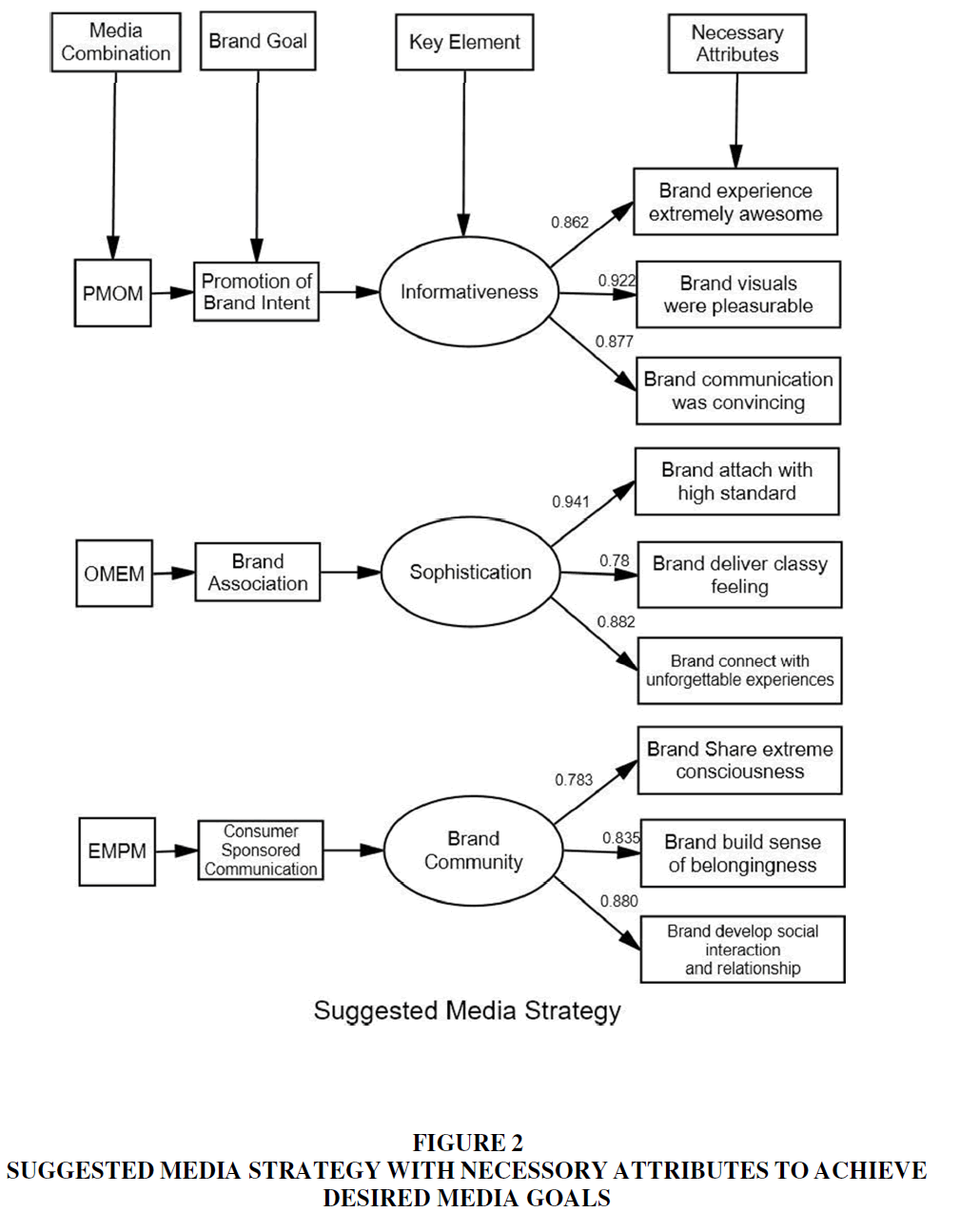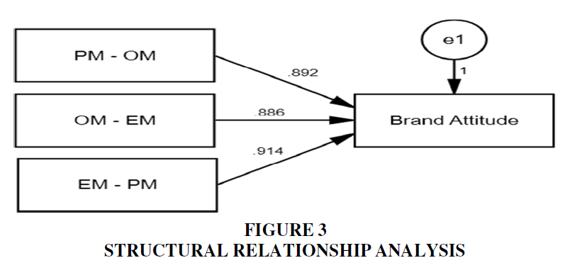 The analysis (coefficient values) reveal three media strategy that can help brand to achieve its strategic goals particularly the building of postive brand attitude using digital media platform. The brand attitude can be developed through three angles viz. ‘promotion of brand intent (PMOM), brand association (OMEM)and consumer sponsored communication (EMPM)’. It primarily focuses upon the first- ‘informativeness’ which broadly includes consumers’ experience with brand (R= .862), brand’s visuals like logo, design, apperarance etc. (R= .922) and the convincing appeal through engaging communication techniques (R= .877). Second- ‘sophistication’ that includes brand’s attachment to high standard, quality of life and the symbol of excellence (R=.941), brand must offer the feeling of class, living standard and pleasuralbe using experience (R= .780), brand must connect with unforgettable user experience (R= .882). Third- ‘brand community’ which represent the niche group of like minded people who love to use a famous brand which make them feel awesome and distinct. Experts call it brand community which build a strong and favorable brand attitude of consumers Figure 2. Result reveals that it can be achieved by displaying brand consciousness, belongingness (R= .922) and developing social interaction & relationship which can boost consumer confidence over the brand performance, luxuary and uniquness (R= .877) Figure 3.