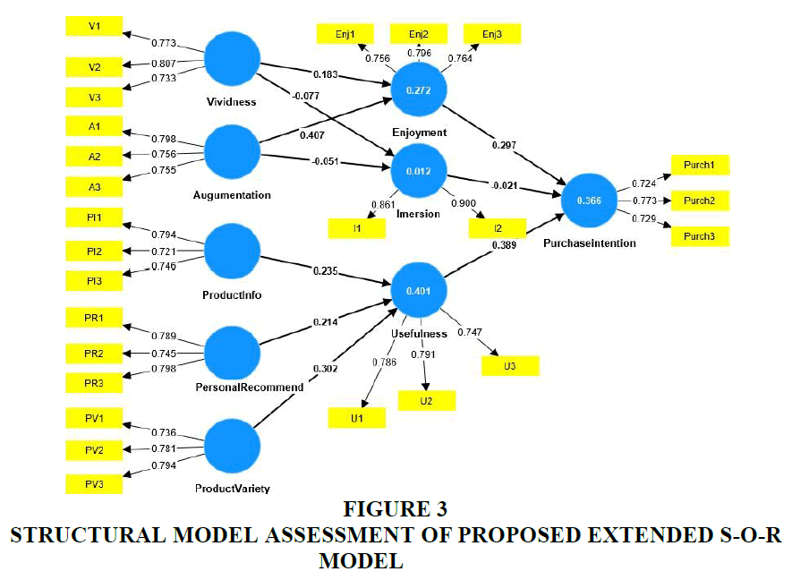 Product diversity (β = 0.302), individual suggestions (β = 0.214), and product accessibility (β = 0.233) all had a substantial impact on perceived usefulness. Purchase intention was strongly influenced by perceived utility (β = 0.389) and felt enjoyment (β = 0.297), confirming H5, H6, H7, H8, and H10. Nevertheless, H2, H4, and H9 were rejected due to non- significant effects in vividness (β = −0.077), augment (β = −0.051), and immerse (β = −0.021). Multicollinearity problems were eliminated because the variation in the inflation factor (VIF) values varied from 1.006 to 1.765, below the threshold of 5 (Hair et al., 2006; Hair et al., 2011) Figure 3, Table 4.
