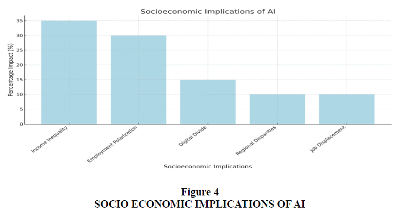 In sum, while AI offers considerable potential to drive economic growth and innovation, its benefits are unevenly distributed. Without targeted interventions, AI adoption may exacerbate existing inequalities by displacing vulnerable workers, eroding the middle class, and deepening the global digital, (2023) divide. Addressing these challenges requires an integrated policy framework that promotes inclusive growth, equitable opportunities, and sustainable labor market transitions. A summary of these socioeconomic implications is presented in Table 4, Figure 4.