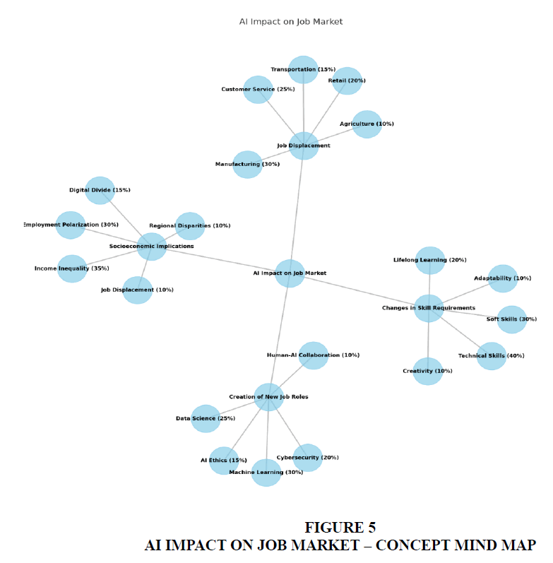 The concept of the job displacement sector wise, new jobs evolution, changes in the skills and the socio economic implications due to AI has been presented in Figure 5.