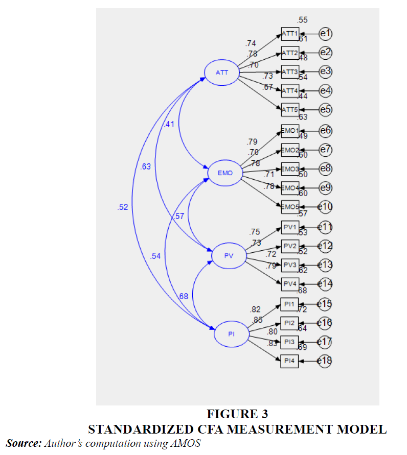 The shared variance was adequate with the given factors with satisfactory communalities (0.452 to 0.724). Strong loadings were observed in pattern matrix (above 0.6), without sensible cross-loadings and solution was met with structural stability after 5 iterations. Theoretically, the 4 factors were reliable with constructs proposed – “Perceived Value (PV), Emotional Response (EMO), Attentional Response (ATT), and Purchase Intention (PI) Table 3.”