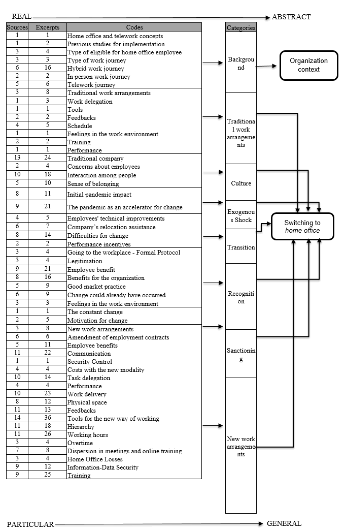 In Figure 1, the source refers to the document from which the excerpts were taken. We coded a total of 496 excerpts and divided them into 53 codes, allocated into eight categories that help explain the change in the institution. We defined the categories as