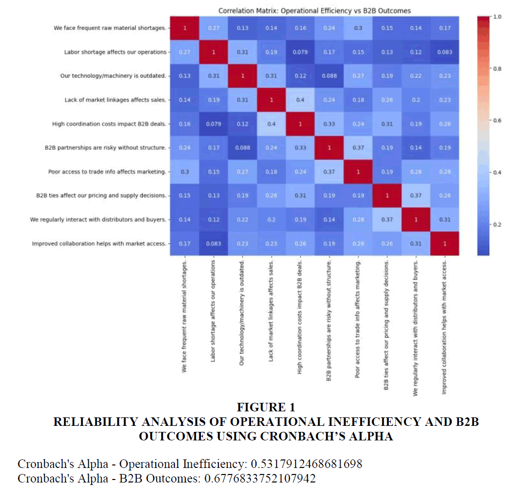 Primary data was collected through structured questionnaires with Likert-scale replies, while secondary data was obtained from research articles, government reports, and scholarly publications. Hypotheses were validated using statistical approaches including descriptive analysis, correlation matrices, OLS regression, and chi-square tests. Cronbach's Alpha was used to assess construct reliability (0.531 for operational inefficiency, 0.678 for B2B outcomes). Factor analysis revealed strong construct consistency.
