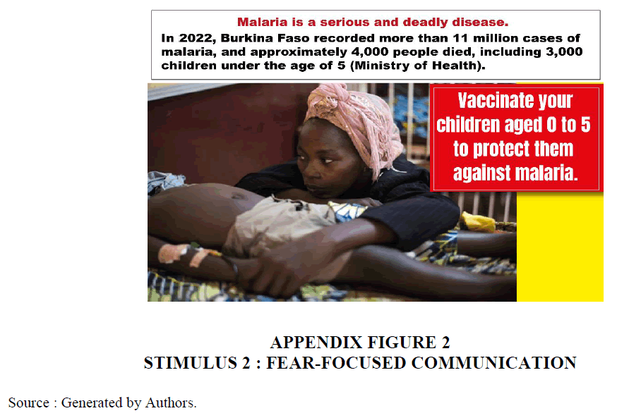 Based on Witte's model (1992; 1998), the second stimulus (stimulus 2 in the appendix) was developed and focused on the severity of the threat and the effectiveness of the recommendations to address it. This stimulus shows the image of a sick and dying child lying on a hospital bed and suffering from malaria under the helpless gaze of his mother. It contains numerical information taken from the statistics of the Burkinabe Ministry of Health on the number of children aged 0 to 5 years who have died from malaria. This persuasive message mentions the existence of an effective vaccine to protect children against malaria. Both stimuli were printed in color on A4 paper for conducting interviews. A conclusive pretest was carried out to ensure, above all, that stimulus 2 conveyed fear.