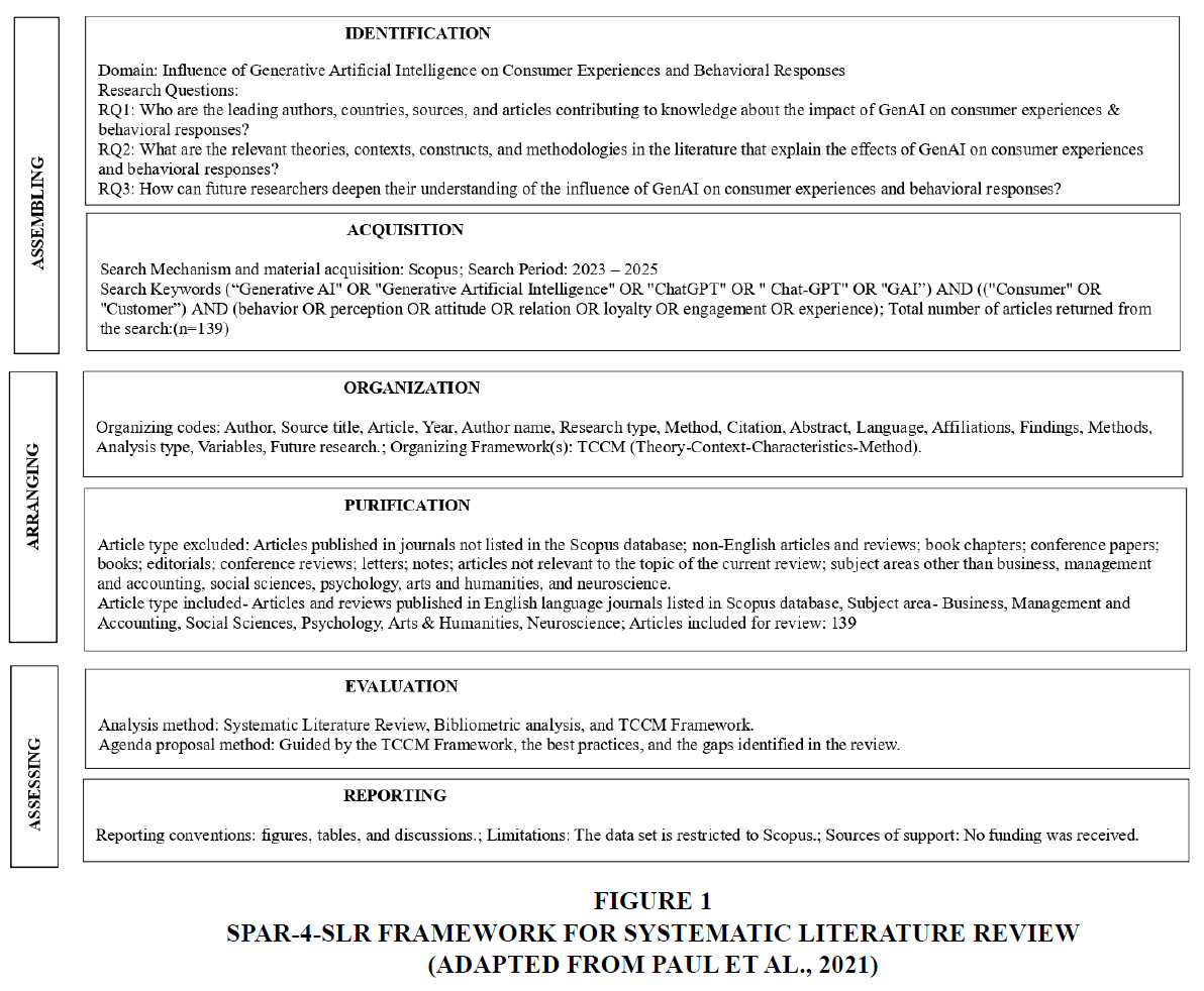 The present SLR employs a robust technique, the SPAR-4-SLR protocol proposed by Paul et al. (2021). This substage of the SPAR-4-SLR structure involves identifying the SLR's research domain, research questions, source type, and source quality. The goal is to examine the impact of Gen AI on consumer experiences and behavioral responses.