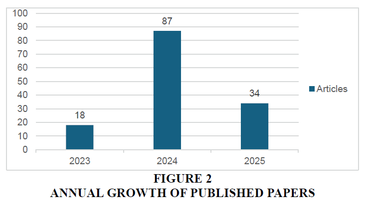 At this stage, the dataset includes peer-reviewed and published works. These papers were collected from the Scopus database, which was chosen for its comprehensiveness compared to other databases like Web of Science, EBSCOhost, and Google Scholar (Bhukya et al., 2022). The search period spans from 2023 to 2025, aligning with the introduction of Generative Artificial Intelligence (Gen AI) in November 2022. This review topic was selected due to the significant increase in publication volume over the past three years and the growing interest among academics and practitioners.