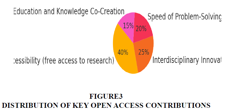The pie chart illustrates the proportional contribution of accessibility, interdisciplinary innovation, problem-solving speed, and equity in education within open-access practices