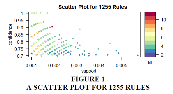A graphical representation of different rules is shown in Figure 1-5. Figure 1 shows 1255 rules using the scatter plot method with min support of 0.001 and min confidence of 0.7. As we decrease the value of the support measure, several rules will be increased. We visualized the rules by plotting confidence, support, and lift in Figure 1, illustrating the relationship between these key metrics. The “support-confidence boundary” creates an optimal rule for the meaningful interpretation of obtained data. On the right side of a scatter plot diagram obtained from that rule, chances of either support, confidence or both may be higher.
