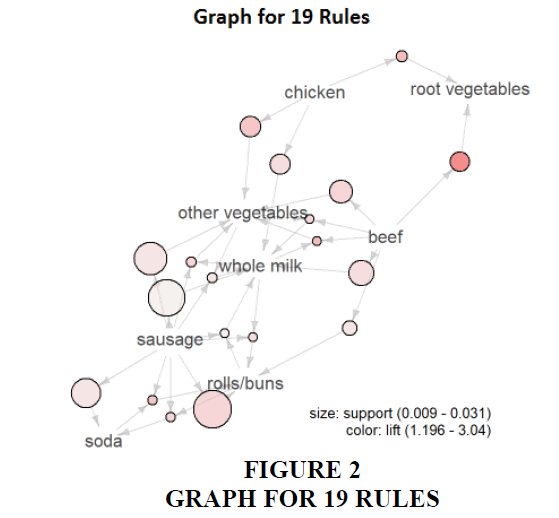 Apart from a scatter plot visualization to identify the rule, the graph-based visualization is more recommended. The darker the circle the more the probability of purchasing two of the selected items than anything else whereas the bigger circle indicates the probability of purchasing both items together. Figure 2 arrow indicates the direction of a possible basket.