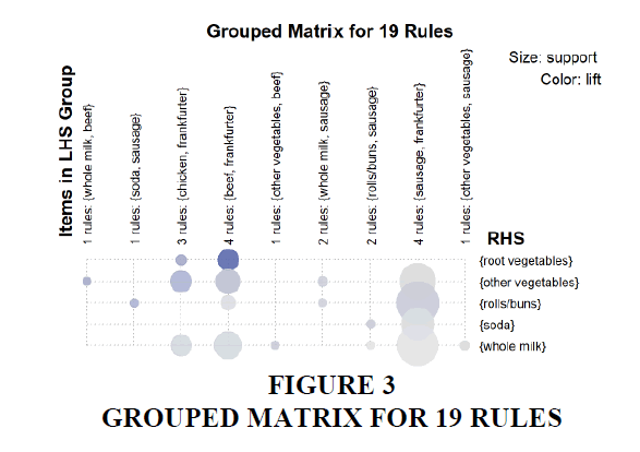 An improved way to present is a Grouped matrix plot shown in Figure 3. It has the same rules before, but additionally, it shows the support of the rules. It can be noted that rules linked with sausages have the most significant support among the listed.