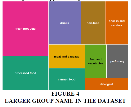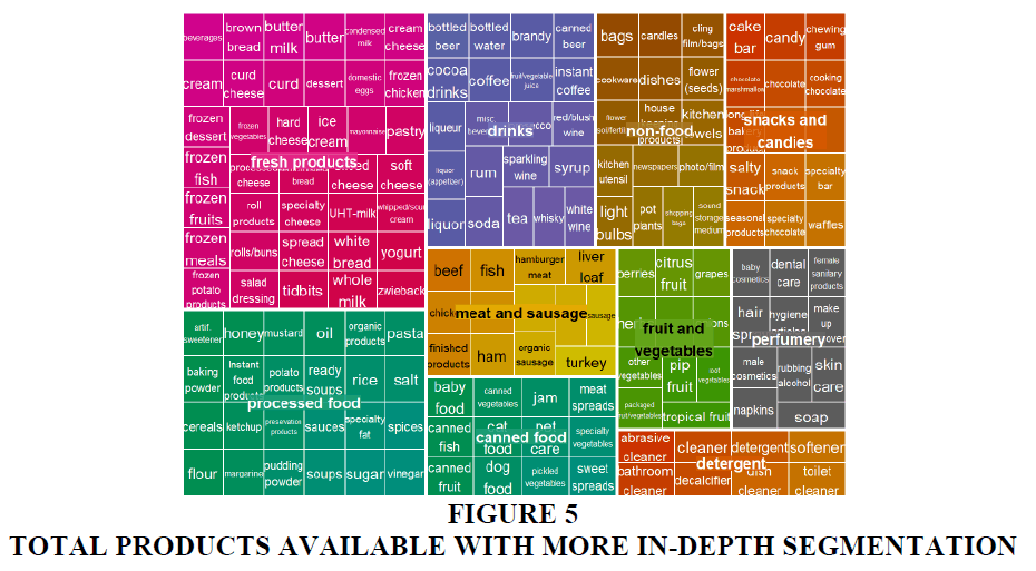 Treemap charts are one of the most advanced tools to represent product segmentation shown in Figure 4,5 and have a different level of depth. Figure 4 shows the bigger group names of categories and Figure 5 shows more in-depth segmentation with available products. With the help of interesting plots, we can analyze data in detail to show how many products of each type are available to buy in the grocery store.