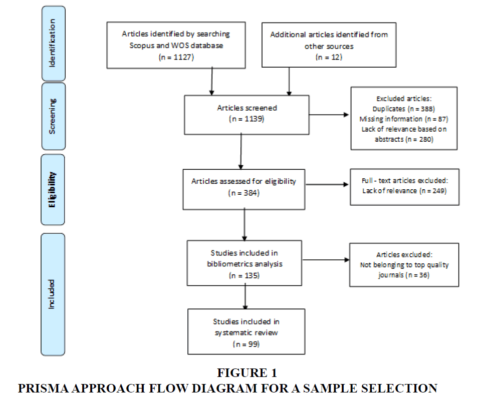 Figure 1 represents a four-step process as suggested by PRISMA guidelines. The first was that we found 1139 articles in the two databases and other sources. Second, after excluding duplicate articles, articles with missing information and irrelevant articles, 384 papers were left for further screening. In the third step, full-text screening of the articles was performed resulting in selection of final 135 articles for bibliometric analysis.