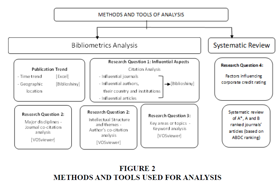Bibliometric citation analysis along with systematic review of literature have been performed, where bibliometric analysis of articles is used to map the knowledge anatomy of the literature base (Li et al., 2017) and to determine the most important research topics/ themes, the literature review part is literature reviewing in order to put forth conclusions and get to know research gaps (Denyer & Tranfield, 2009). We applied publication trends, citation analysis, co-citation analysis and keyword analysis (Bahoo, 2020; Goyal & Kumar, 2021) using VOSviewer software and Biblioshiny package from R studio. Figure 2 provides information about the methodology, tools and software used for the analysis.