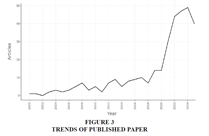 Figure 3 depicts the trend in published papers focusing on innovations adopted for supply chain improvement in manufacturing sector during the period 2000 to 2025. The publications have grown since 2018. The inventions embraced in enhancing SCM in manufacturing. The results revealed an increase in firms after the year 2018. It has been attributed to various reasons which among them are the necessity to have greater efficiency, strength, and flexibility to accommodate the dynamic nature of the marketplace and consumer preferences advancements. These needs have been pointed out by the trade concerns, the global disruption including the pandemics, and increasing complexity of supply chains. Metis can be explained by the innovations provided by IoT, AI and machine learning which helped manufacturing firms to enhance the supply chain operations and reduce costs substantially and increase operational efficiency. As an example, IoT devices deliver real-time data, enabling proactive decisions making and maintenance, which eliminates downtime and maximises productivity (Ben-Daya et al., 2019). The increasing importance of more individualized products and quicker time of delivery necessitates a more pliant supply chain. Advanced robotics form of additive manufacturing enables the manufacturers to swiftly respond to changes without the whole chain of supply. (Frank et al., 2019). The covid pandemic shows that the supply chains of the world need complications. Firms within the manufacturing industry are employing the emerging technologies like blockchain to improve transparency and traceability as well as AI in predicting outcomes in a bid to improve supply chain resilience (Ivanov & Dolgui, 2020). As awareness and legislation around environmental impact increases, technology that enables mechanisms to reduce waste and [boost] sustainability has become key. For example, AI and advanced data analytics enable better resource management and reduction of carbon footprints (Dubey et al., 2019). These advances are not just stunts, and they are replacing the element of modern supply chain strategies which are being transformed to integrate into the changing challenges and opportunities of the global market.