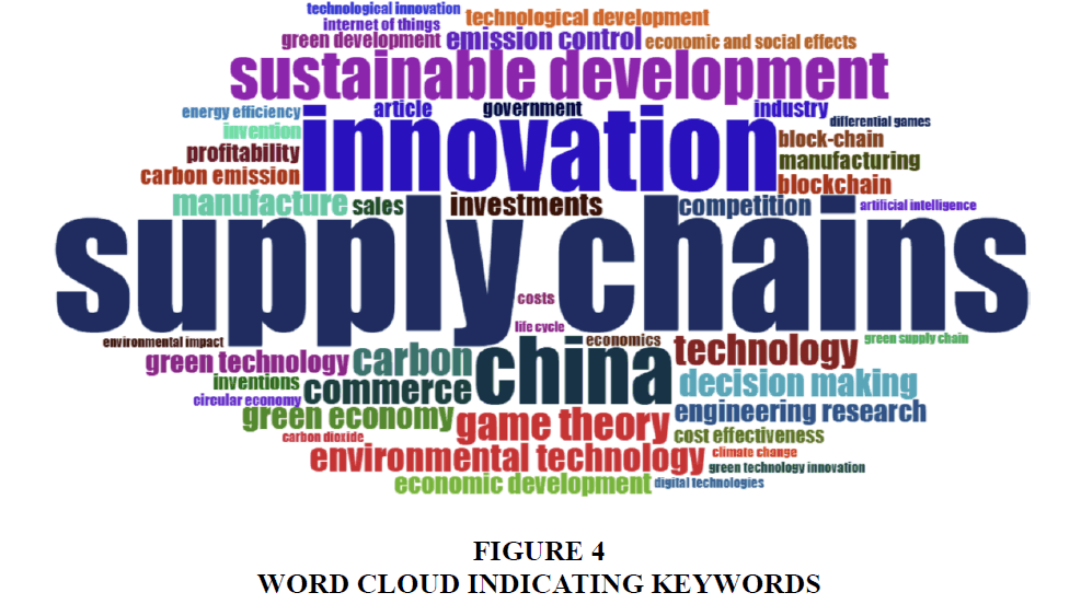 The study includes keywords analysis, which determines the most often used keywords in the chosen researches’ papers showing the pertinence of the word in the literature. Figures 4 & 5 shows the keywords dynamics presented through a word cloud where the size of a word corresponds to its frequency. The figure presents the top 40 most frequently used keywords. The term ‘Supply chain” appeared 15 times, followed by ‘Innovation’, ‘Sustainable development’, ‘China’, ‘Technology’ and ‘game theory’ etc. This highlights the importance of these factors for the supply chain management innovative practices. Apart from these, different keywords related to supply chain innovations like the blockchain, green technology, internet of things, artificial intelligence, carbon emission etc are indicated by the word cloud.