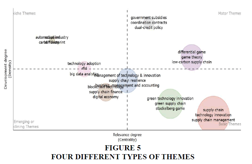 Thematic analysis was performed to understand the different emerging themes related to the innovations in supply chain management in the manufacturing sector. The paper used the existing literature to identify the research themes, sub-fields and disciplines (Osareh, 1996; Small, 1973). Figure 5 depicts the different types of themes related to the subject area of innovations in the manufacturing sector. The figure shows four different categories of themes namely emerging themes, Niche themes, Basic themes and Motor themes. The classification of these themes is based on two dimensions: relevance and development. The basic themes are helpful of the researcher to identify the themes which are highly relevant but not much developed. The basis themes as shown in figure are ‘supply chain technology innovations’, green technology innovations, green supply chain, Stackelberg game etc. These themes need in-depth research for better understanding of the topics.